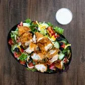 Hand Battered Fried Chicken Tenders on a bed of Crisp Lettuce Blend, Tomatoes, Cucumbers, Black Olives & Cheese. Served with your choice of Dressing.