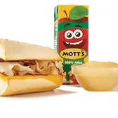 Oven-roasted turkey and aged cheddar cheese served warm on French Parisian bread with choice of fruit (45 cal), applesauce (40 cal) or bag of chips (140-300 cal). For kids 12 and under. Includes kid’s fountain beverage (0-170 cal), apple juice (100 cal) or whole milk (150 cal).
