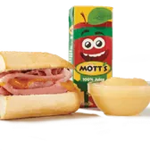 Ham and aged cheddar cheese served warm on French Parisian bread with choice of fruit (45 cal), applesauce (40 cal) or bag of chips (140-300 cal). For kids 12 and under. Includes kid’s fountain beverage (0-170 cal), apple juice (100 cal) or whole milk (150 cal).