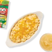 Blend of cheeses folded into elbow pasta topped with cheddar and baked. Served with choice of fruit (45 cal), applesauce (40 cal) or bag of chips (140-300 cal). For kids 12 and under. Includes kid’s fountain beverage (0-170 cal), apple juice (100 cal) or whole milk (150 cal). (V)