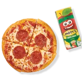 Pepperoni, mozzarella and pizza sauce on half of a regular pizza crust. For kids 12 and under. Includes kid’s fountain beverage (0-170 cal), apple juice (100 cal) or whole milk (150 cal).