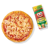 Mozzarella and pizza sauce on half of a regular pizza crust. For kids 12 and under. Includes kid’s fountain beverage (0-170 cal), apple juice (100 cal) or whole milk (150 cal). (V)