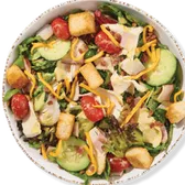 Chicken, bacon, ham, turkey, mixed greens, tomatoes, cucumbers, cheddar and croutons served with honey mustard dressing.