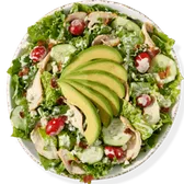 Chicken, romaine blend, bacon, tomatoes, cucumbers, feta, avocado and green onions served with green goddess dressing.