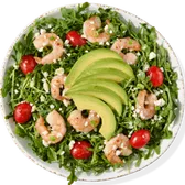 Seasoned shrimp, arugula, avocado, feta, tomatoes and green onions served with Lemon Basil Vinaigrette dressing.
