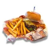 Old fashioned 1/2 pound burger served with crisp bacon, American cheese, lettuce, tomato, pickle, onion and mustard. Served with your choice of homemade chips, fries or tater tots.