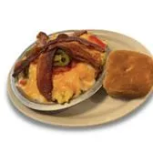 Crispy Chicken tenders and bacon stacked over our homemade biscuit, scrambled eggs, hash browns and cheddar cheese smothered in cream gravy. You can do it!