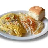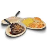 Flavorful eight ounce rib-eye steak, grilled the way you like it, with three eggs, any style. Served with a big ole cinnamon roll and hash browns or grits, and homemade biscuits or toast.