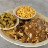 A certified chopped sirloin served with mushrooms, onions and Norma's Cafe homemade brown gravy. Served with your choice of two fresh made veggies and Norma's Café homemade rolls and cornbread.