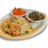 Two catfish fillets lightly battered and fried golden brown. Served with our homemade hush puppies and tartar sauce. Served with your choice of two fresh made veggies and Norma's Café homemade rolls and cornbread.