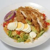 Your choice of chicken over crisp mixed greens with diced tomatoes, onions, boiled eggs, shredded Cheddar cheese and Norma's homemade croutons . Served with your choice of dressing on the side.