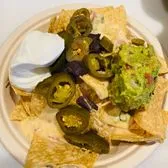 Tortilla Chips with Queso, Beans, Sour Cream, Guacamole and Jalapeños.