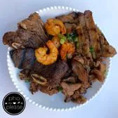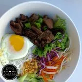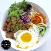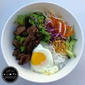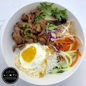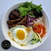 Contains Peanuts. Dry rice noodles and grilled beef short ribs, served with a fried egg, cucumbers, sprouts, lettuce, picked carrots/daikons, pickled cabbage, purple cabbage, green onions, peanuts and house fish sauce.