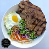 Contains Peanuts. Dry rice noodles and grilled pork, served with a fried egg, cucumbers, sprouts, lettuce, picked carrots/daikons, purple cabbage, pickled cabbage, green onions, peanuts and house fish sauce.