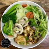 Contains Peanuts. Vegan. Dry rice vermicelli noodles and tofu, served with cucumbers, sprouts, lettuce, picked carrots/daikons, pickled cabbage, purple cabbage, green onions, peanuts, mushrooms, steamed veggies & side of peanut sauce.