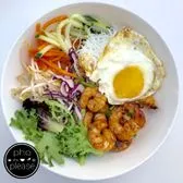 Contains Peanuts. Contains Shellfish. Dry rice noodles and grilled shrimp, served with a fried egg, cucumbers, sprouts, lettuce, picked carrots/daikons, pickled cabbage, purple cabbage, green onions, peanuts and house fish sauce.