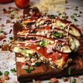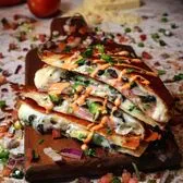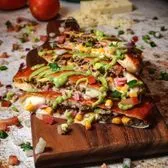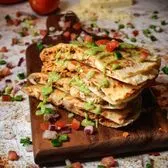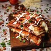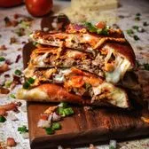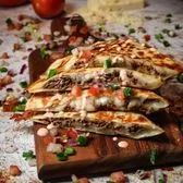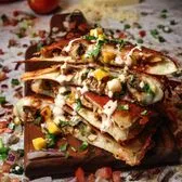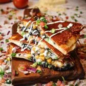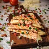12 inch flour tortilla filled with Jack Cheese, grilled chicken, fresh basil pesto, sautéed mushrooms, cherry tomatoes, and pita chips. Served with chips, elote, and a drink