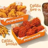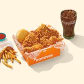 Two pieces of Popeyes' signature juicy, seasoned chicken with a side, buttermilk biscuit and a drink. Simple perfection.