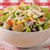Romaine lettuce topped with shredded red cabbage, cucumbers, shredded cheese, diced tomatoes, and croutons. Served with your choice of dressing on the side.