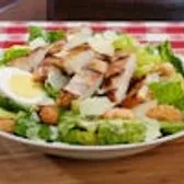 Everything includes a crispy bed of romaine lettuce topped with a hardboiled egg, croutons, and freshly grated parmesan cheese. Caesar dressing served on the side.