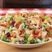 Our famous Chopped Salad with chopped romaine, iceberg lettuce, red cabbage, ditalini pasta, bacon, tomatoes, Gorgonzola cheese, green onion, topped with crispy Spicy Chicken and hot Giardiniera peppers.