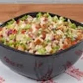 Everything includes chopped romaine, iceberg lettuce and red cabbage with diced chicken breast, ditalini pasta, bacon, tomatoes, Gorgonzola cheese and green onion. Served with our House Dressing on the side and includes serving utensils. Small serves 8-10 sides.