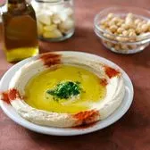 Mashed chickpeas mixed with tahini, lemon juice, and garlic; served with pita. Soaked, boiled, blended daily.