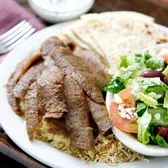 Grilled gyro meat diced with onions & tomatoes served on a bed of rice with, tzatziki sauce, pita and choice of side