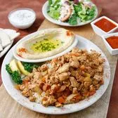 Diced chicken breast shawarma with onions & tomatoes served on vermicelli rice, with tzatziki sauce pita and your choice of side