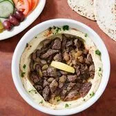 A large bowl of hummus with your choice of meat with grilled onions; served with pickled veggies and pita.