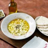 Crumbled Greek feta cheese with drizzled extra virgin olive oil, oregano, and zatar; served with pita.