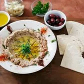 Roasted eggplant mixed with tahini, lemon juice, and garlic; served with pita