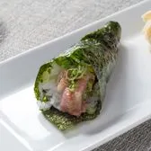 Fresh yellowtail mixed with Sriracha, combined with cucumber and rolled into a cone shape resembling an ice cream cone.
