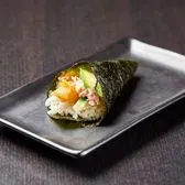 Lightly battered Tempura fried shrimp, krab† mix, asparagus, avocado, and cucumber rolled into a cone shape resembling an ice cream cone.