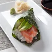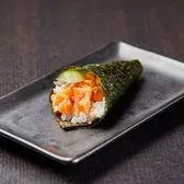 Fresh salmon* mixed with spicy mayo combined with cucumber, rolled into a cone shape resembling an ice cream cone.