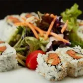 The classic †California Roll topped with tuna, yellowtail, shrimp, salmon and avocado to look like a rainbow. Served with miso soup and uchi no salad.