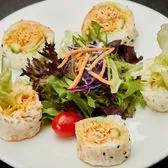Spicy lobster Krab† mix, romaine hearts, avocado and cucumber, rolled in rice and soy paper. Served with miso soup and uchi no salad.