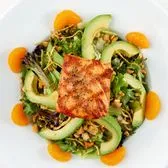 Grilled Salmon tossed with cashews, edamame, carrots and mixed greens in Japanese vinaigrette, topped with avocado, mandarin oranges and fried noodles