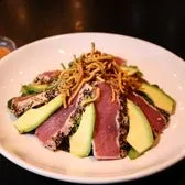 Seared ahi tuna with creamy tataki sauce drizzled with uchi no dressing, placed over a bed of mixed greens with sliced avocado and fried noodles.