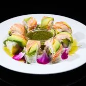 Snow crab, avocado, cucumber; topped with snow crab, sliced avocado; served with Asian pesto sauce and mango tobiko