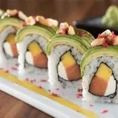 Smoked salmon, mango and cream cheese; topped with avocado, red tempura bits, sautéed cashews and mango and sweet eel sauces