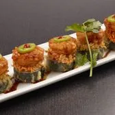 Spicy yellowtail mix, cucumber, avocado, jalapeño and cilantro; topped with yellowtail, green onion, crispy garlic, and togarashi. Served with chili ponzu sauce