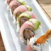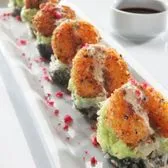 Lightly battered Krab† and cream cheese; topped with guacamole and “RA”ckin’ shrimp; finished with ginger teriyaki sauce, red tempura bits and togarashi