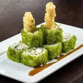 Lightly battered Krab† and cream cheese; topped with guacamole and “RA”ckin’ shrimp; finished with ginger teriyaki sauce, red tempura bits and togarashi