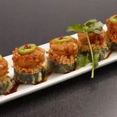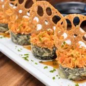 Lightly battered Krab† and cream cheese; topped with spicy tuna, krab† mix and sliced lotus root. Finished with sweet eel sauce and green tempura bits