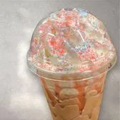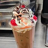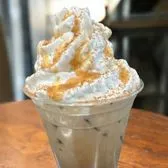 We start with with our amazing espresso. 2 Shots in the Medium and large. We add in our dairy base vanilla powder, heaping cup of ice, milk of your choice and caramel sauce, caramel drizzle and blend. Topped with our house made whipped cream, caramel drizzle and gold finishing sugar crunch to garnish! ***We add our dairy base mix for an extra creamy consistency. Make sure to select no Dairy Base, no whip and another milk option if needed. Removing the milk base can lead to a less thick consistency.