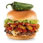 Topped with pepper-jack, crispy jalapeños, Scorpion Pepper Sauce, pickles, hot rings, lettuce, tomato and roasted garlic aioli. This one is fire!