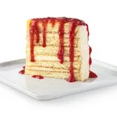 Light and refreshing lemon cake layered with lemon mousse and white chocolate bits, topped with lemon curd and strawberry purée. Limited time while supplies last.