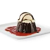 Chocolate brownie cake with hot fudge and strawberry puree, served à la mode. Comes cold, heat at home in your microwave on high for 30 seconds.