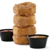 Eight cinnamon and sugar croissant donut rings served with caramel and fudge.